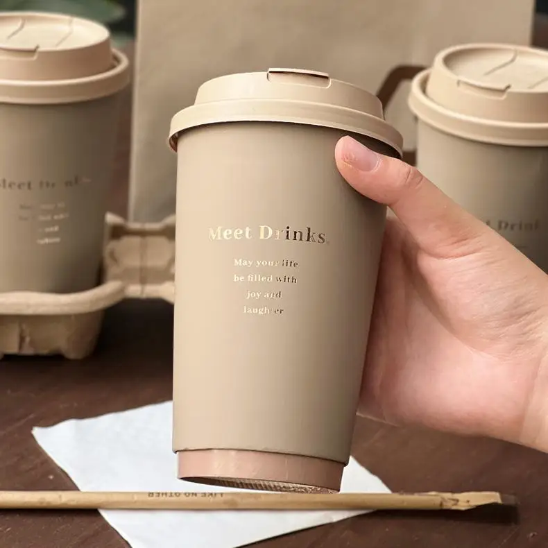 manufacturers china custom logo biodegradable Cafe Shop Gold Stamping double wall paper cup with Lid and Sleeve for coffee disposable paper coffee cup.