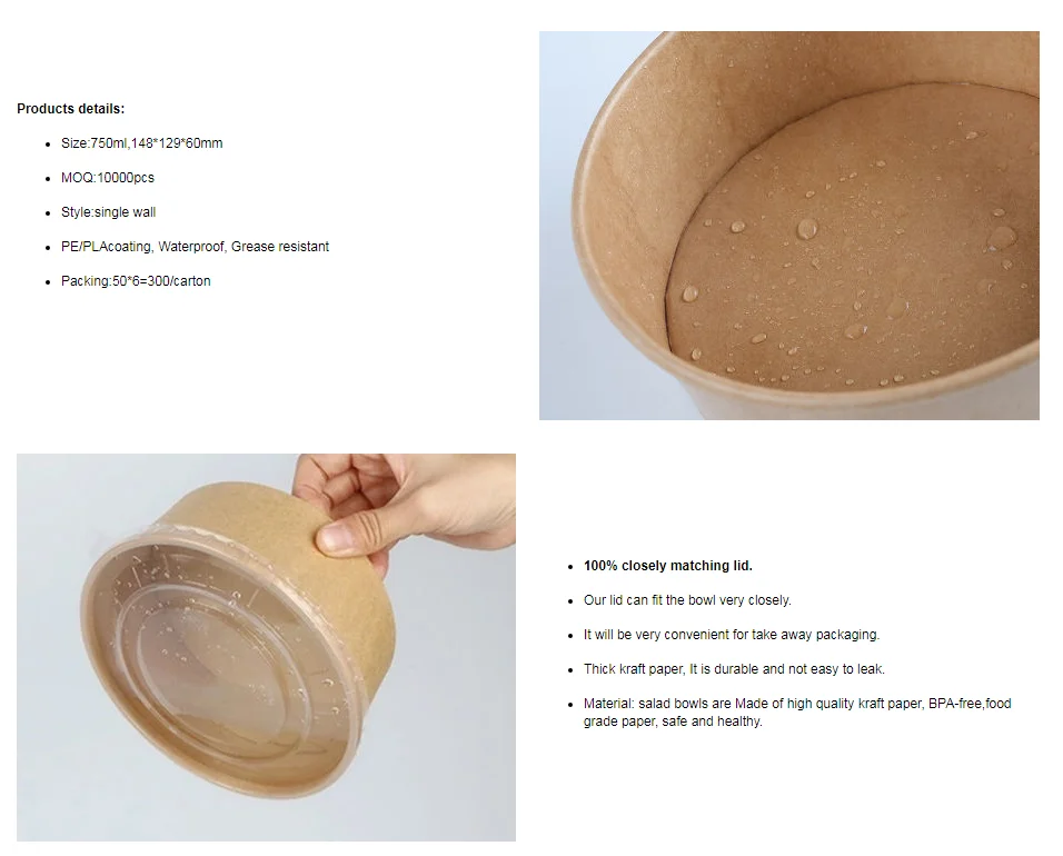 2. great PE coated3. oil proof and water proof4. solid paper to avoid soft5. paper salad bowl with PET lid