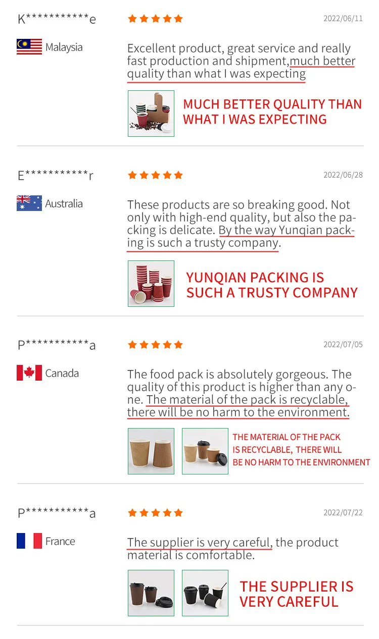Company ProfileDayu Paper&Plastic Product Co.,Ltd is a experienced and professional paper food packaging manufacturer and exporter in Fujian China since 2009.We integrates the materials sourcing,products development and design, printing and manufacture,and export all in one systerm.We are specialized in coffee cup single wall and double wall,Ice cream cup,soup tub, salad bowl and paper or plastic lid for option,Lunch box,Burger box,Party paper plate&cup sets,paper straws,and bags. On the food grade paper material we can do both PE coating and PLA coating on the kraft paper or white coated paper. On the printing,we do both flexo printing and offset printing. Based on 10,000 square meter factory,we have 80 running machines,including roll die-cutting machine,printing machine and form machine.Our production capacity reaches about 20 shipping containers each month.We have two hundreds of mould equipments to satisfy customers' requirements,professional machine operated technician, high efficiency sales team,competitive price and strict quality control process,timely delivery service.We attract customers all over the world and keep fixed long-term coorperation customer groups from Europe,South America,USA,Australia and Korea.After 13 years' development,Dayu have become a well-known brand factory in the food paper packaging industry,we supply paper cup for several famous brands in domestic and overseas,such as KFC. Our commission is: A GREENER WORLD, A GREENER YOU!FAQ1. who are we?